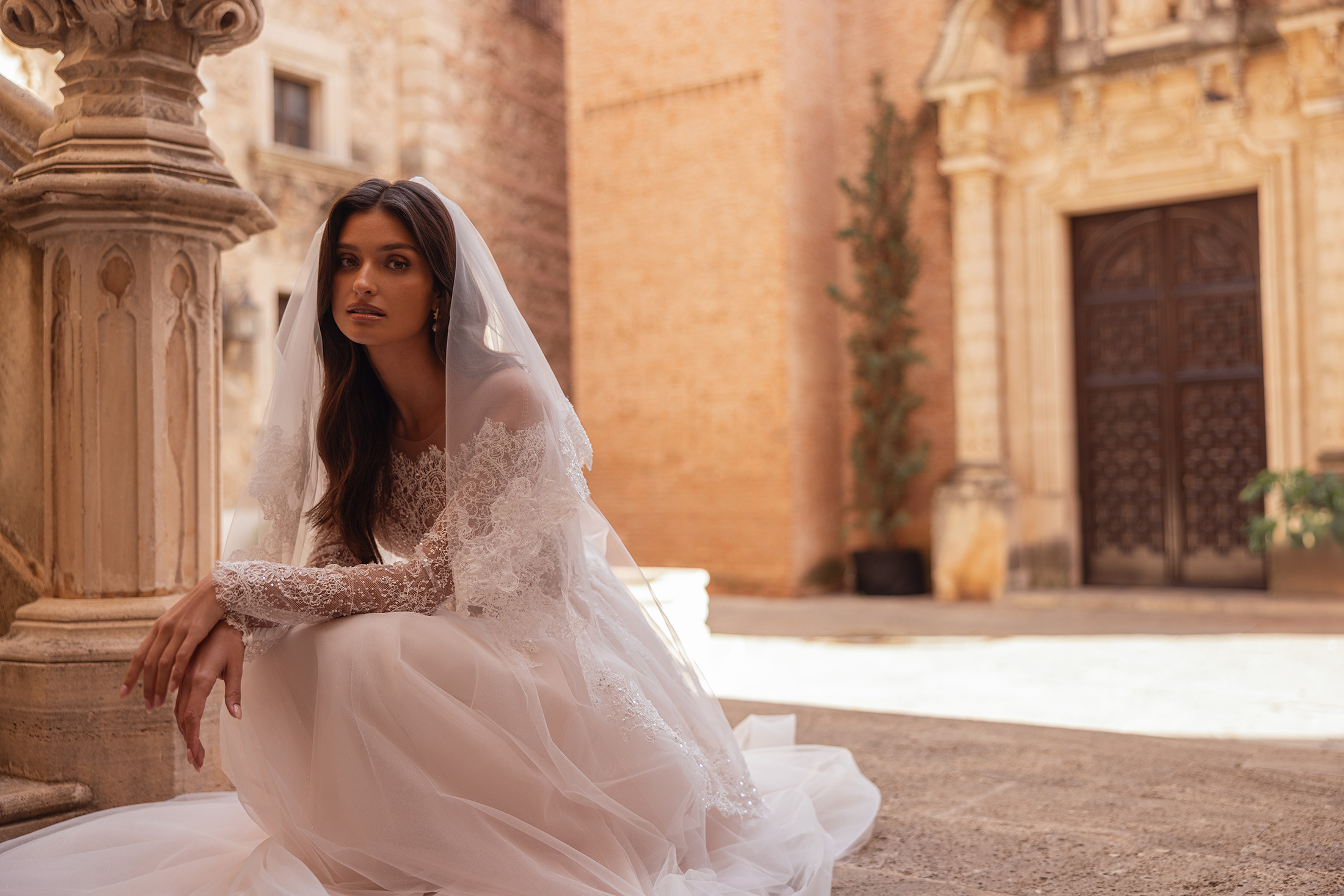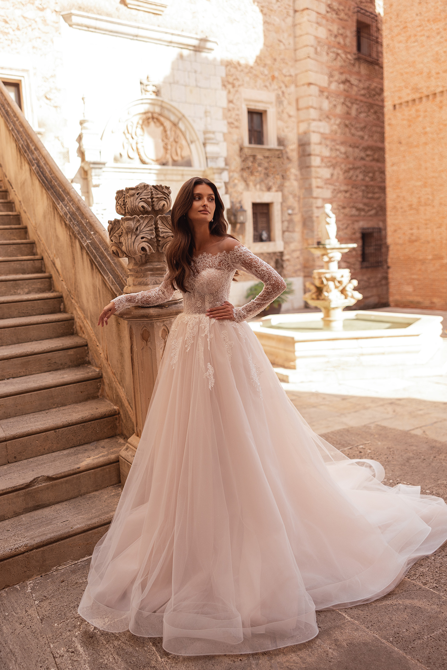 Ethereal and refined, the Yusia gown embodies romantic elegance with a soft, regal presence. The bodice is crafted entirely in delicate Chantilly lace, embellished throughout with fine beads and subtle sequins that create a refined, luminous shimmer. An off-the-shoulder neckline paired with long sheer lace sleeves forms a graceful, couture-inspired silhouette. Lace motifs trail softly over the waistline, blending seamlessly into the skirt. Finished with an airy tulle skirt and a matching lace veil, Yusia offers a beautifully feminine and timeless bridal statement.
