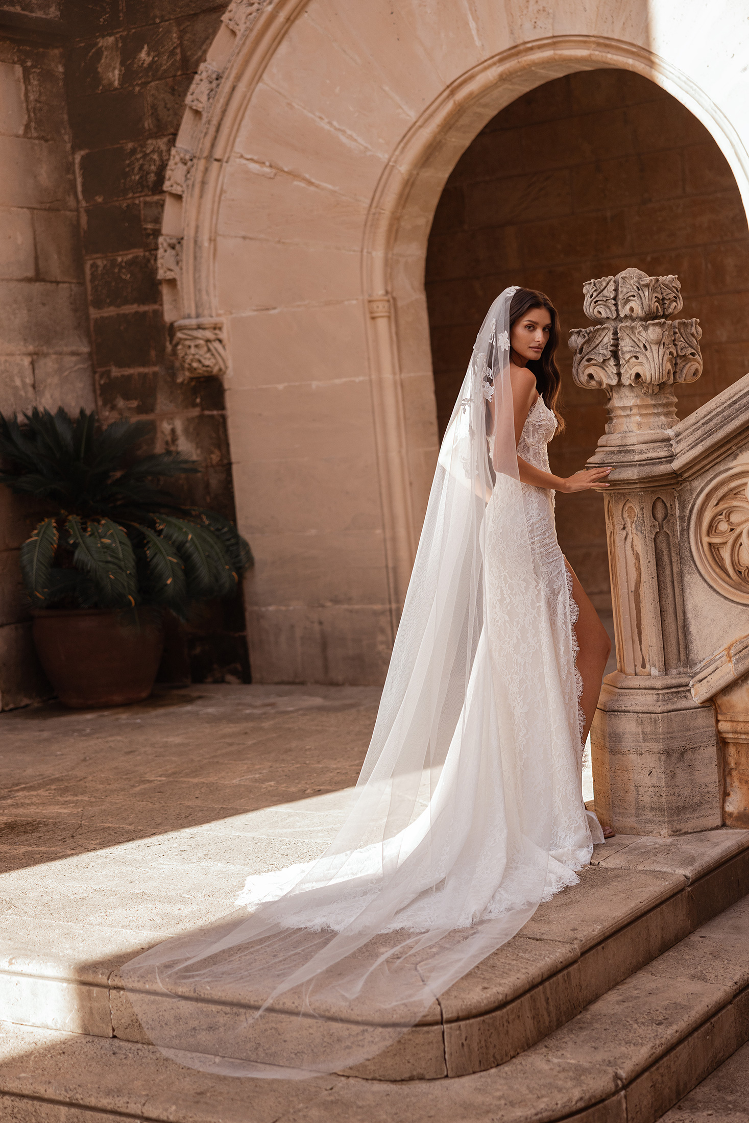 Designed to leave an unforgettable impression, this gown captivates from the very first glance. Tailored in exquisite allover Chantilly lace layered over a soft glitter base, it features a striking high slit and a sculpting V-shaped waistline that beautifully defines the figure. The fitted silhouette is enhanced by refined lace detailing that flows seamlessly through the gown. A detachable long-sleeved, high-neck lace bolero adds a regal, royal touch, allowing for a versatile couture look. Finished with a matching lace veil, this design exudes timeless elegance and standout sophistication.