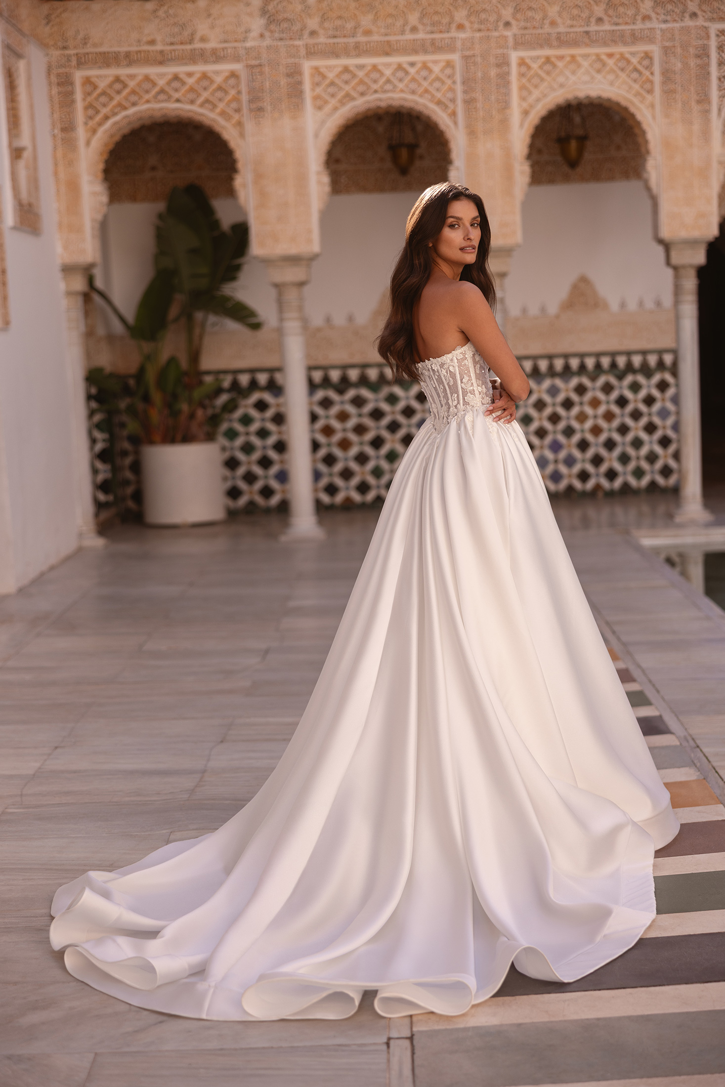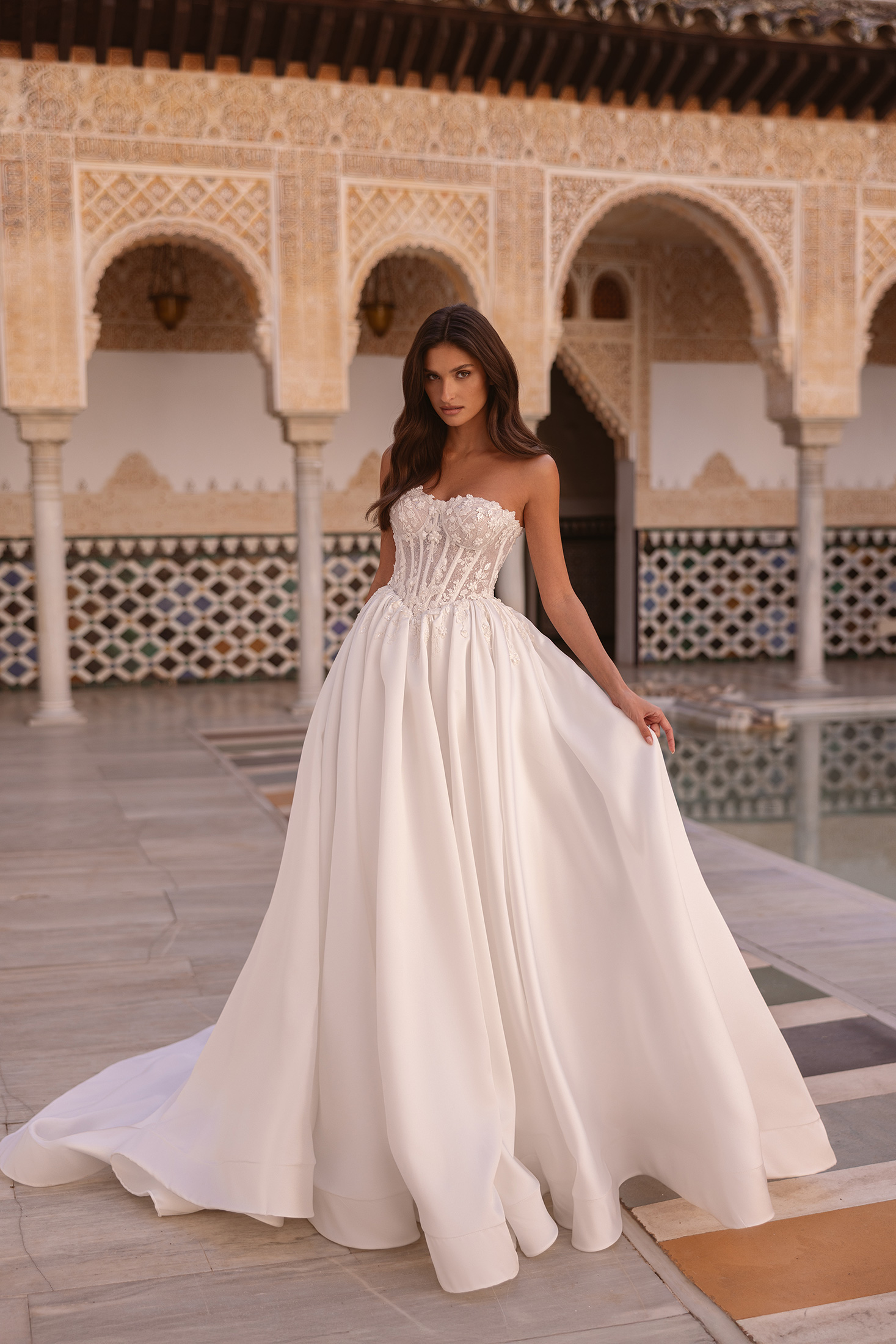 Simple, refined, yet unforgettable, this gown is the embodiment of modern bridal elegance. The strapless boned lace corset with defined bust cups is delicately embellished with beaded appliqués that flow seamlessly over the V-shaped waistline. From there, the design transitions into a clean A-line mikado skirt with pockets, creating a beautifully balanced silhouette. The contrast between intricate lacework and smooth structure gives the gown a quietly striking presence that feels effortlessly contemporary.