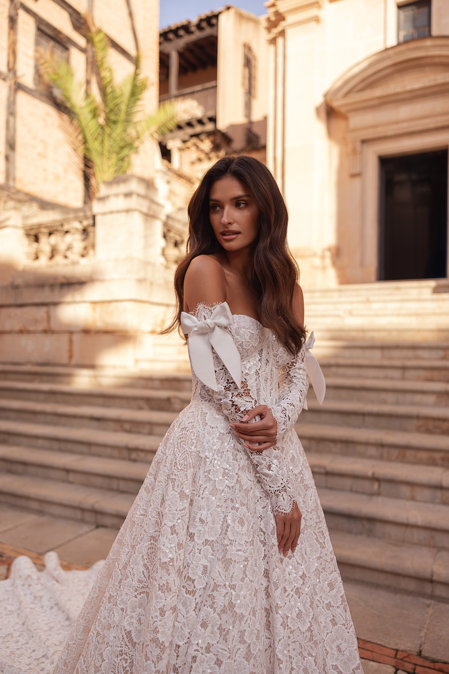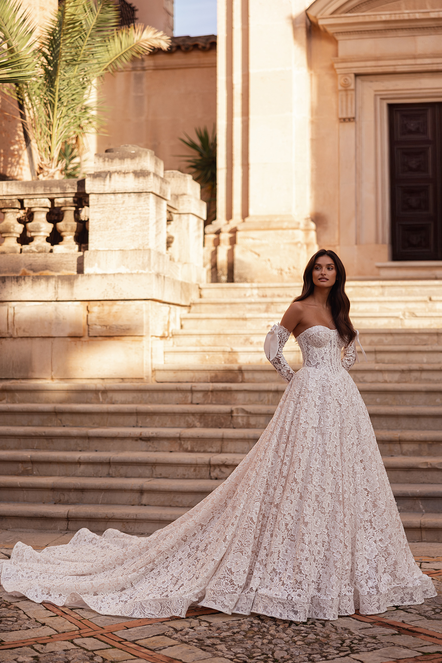 Brooklyn unfolds like a love letter written in lace and light. Designed in allover sequinned floral lace, the dress features a sculpting boned corset with defined bust cups for a beautifully balanced silhouette. The flowing lace skirt adds movement and elegance, while detachable long lace sleeves adorned with bows complete the look with understated charm.