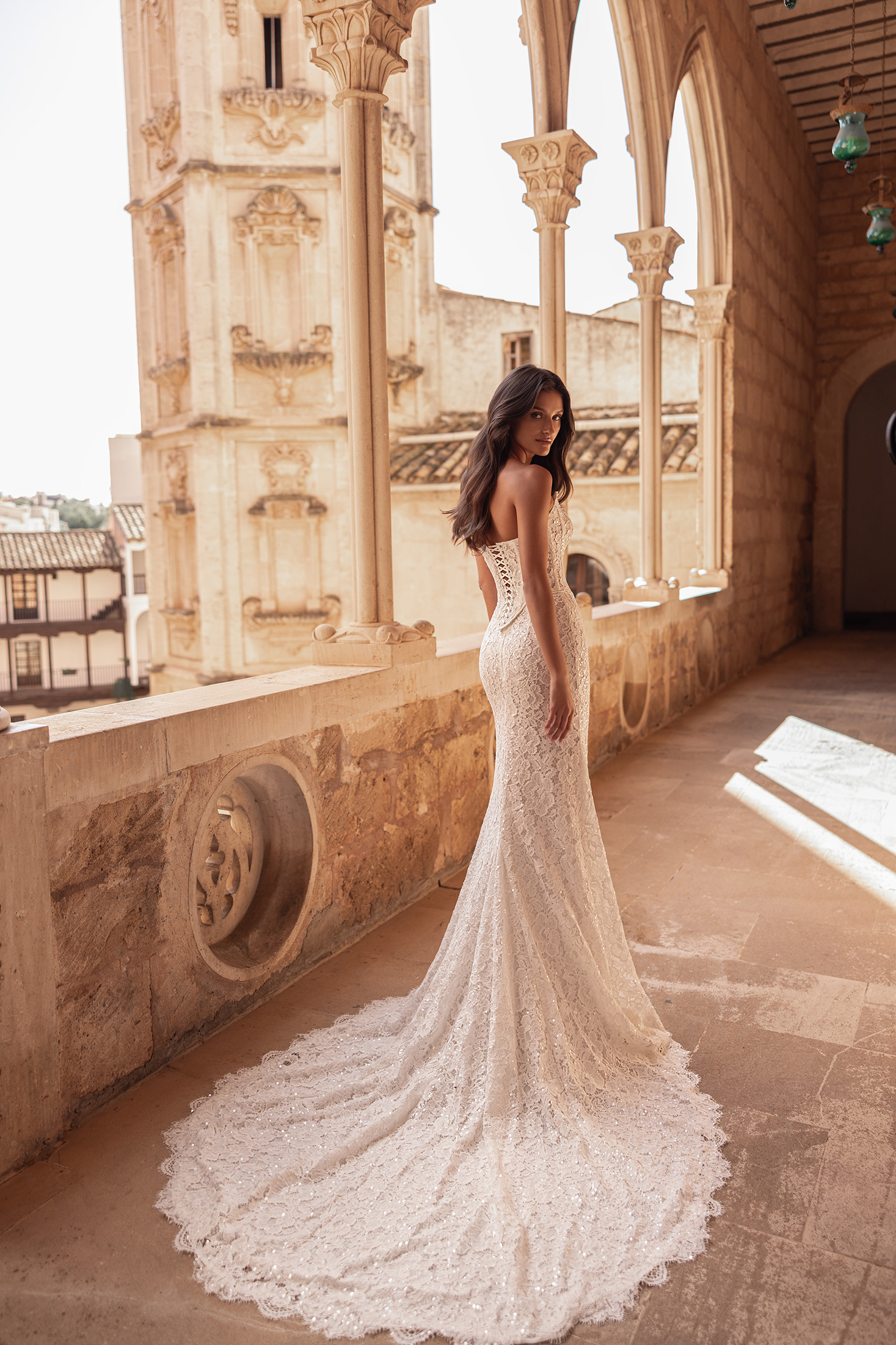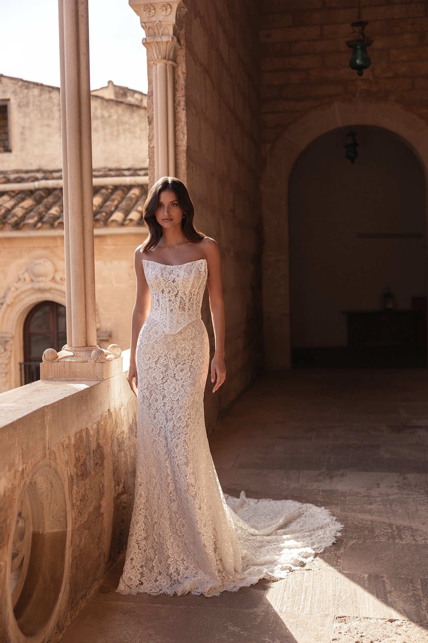Klara is an absolute showstopper, crafted in allover sequinned floral lace that catches the light with every step. The strapless bodice features a hand-beaded neckline and a lace-up corset back for a beautifully contoured fit. A detachable basque defines the waist with sculptural elegance, leading into a streamlined skirt and soft train. The look is finished with a matching veil, creating a seamless and unforgettable ensemble.