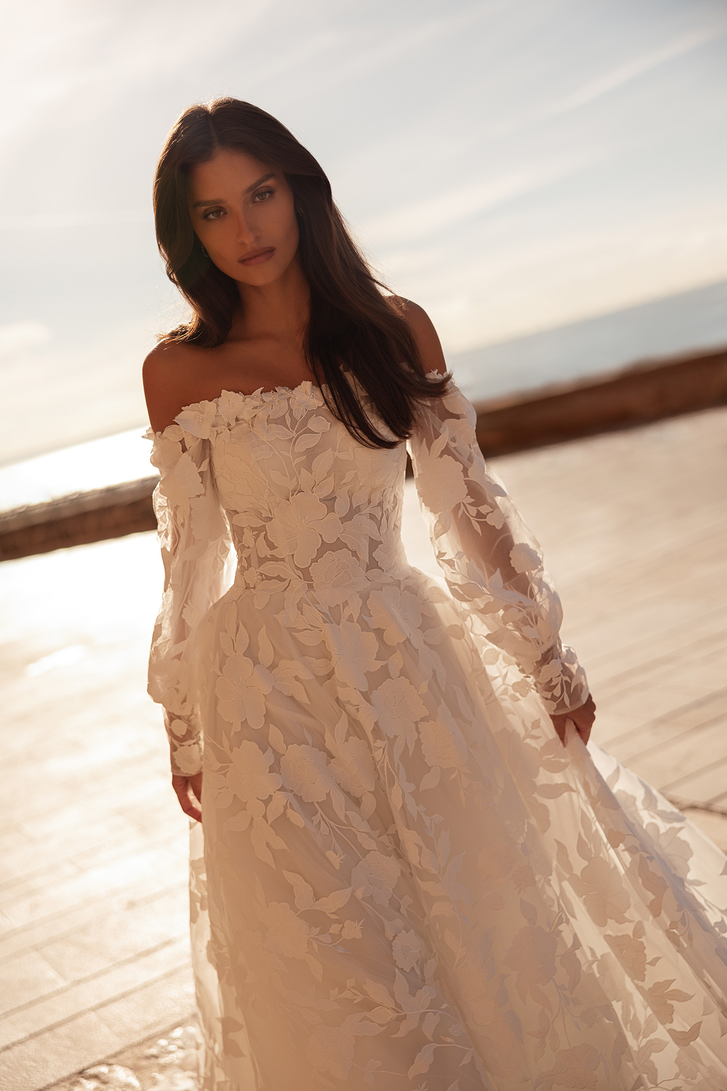 Soft yet striking, this gown captures romance in its most effortless form. Designed with an off-the-shoulder neckline accented by dimensional floral lace, the dress features long sheer puff sleeves and an airy floral lace composition that floats all over the silhouette. The fitted bodice gently defines the waist before flowing into a full, graceful skirt with natural movement and a soft train. Delicate floral motifs throughout add texture and depth, while the lightness of the fabric gives the gown an ethereal, sunlit elegance from every angle.