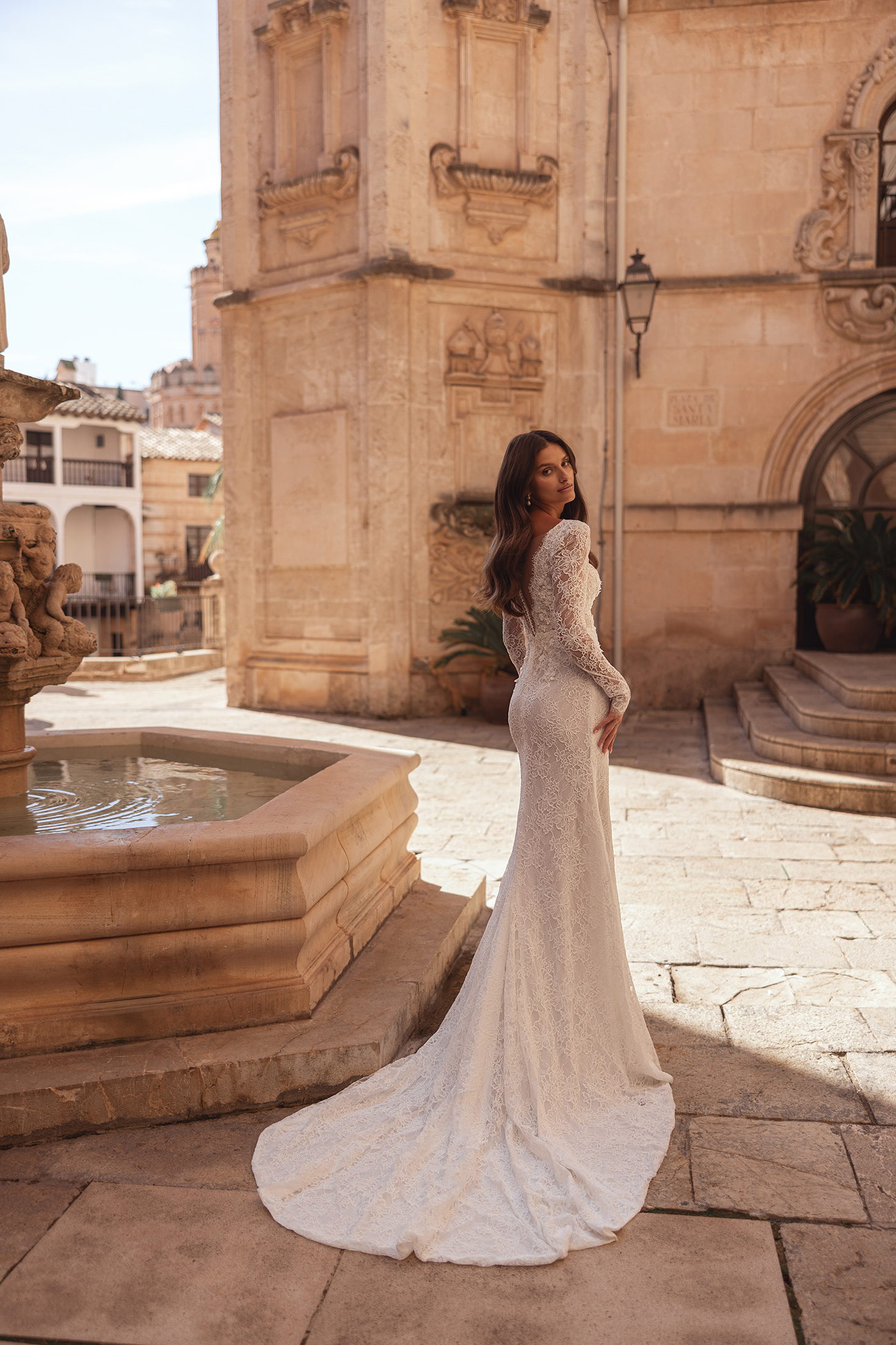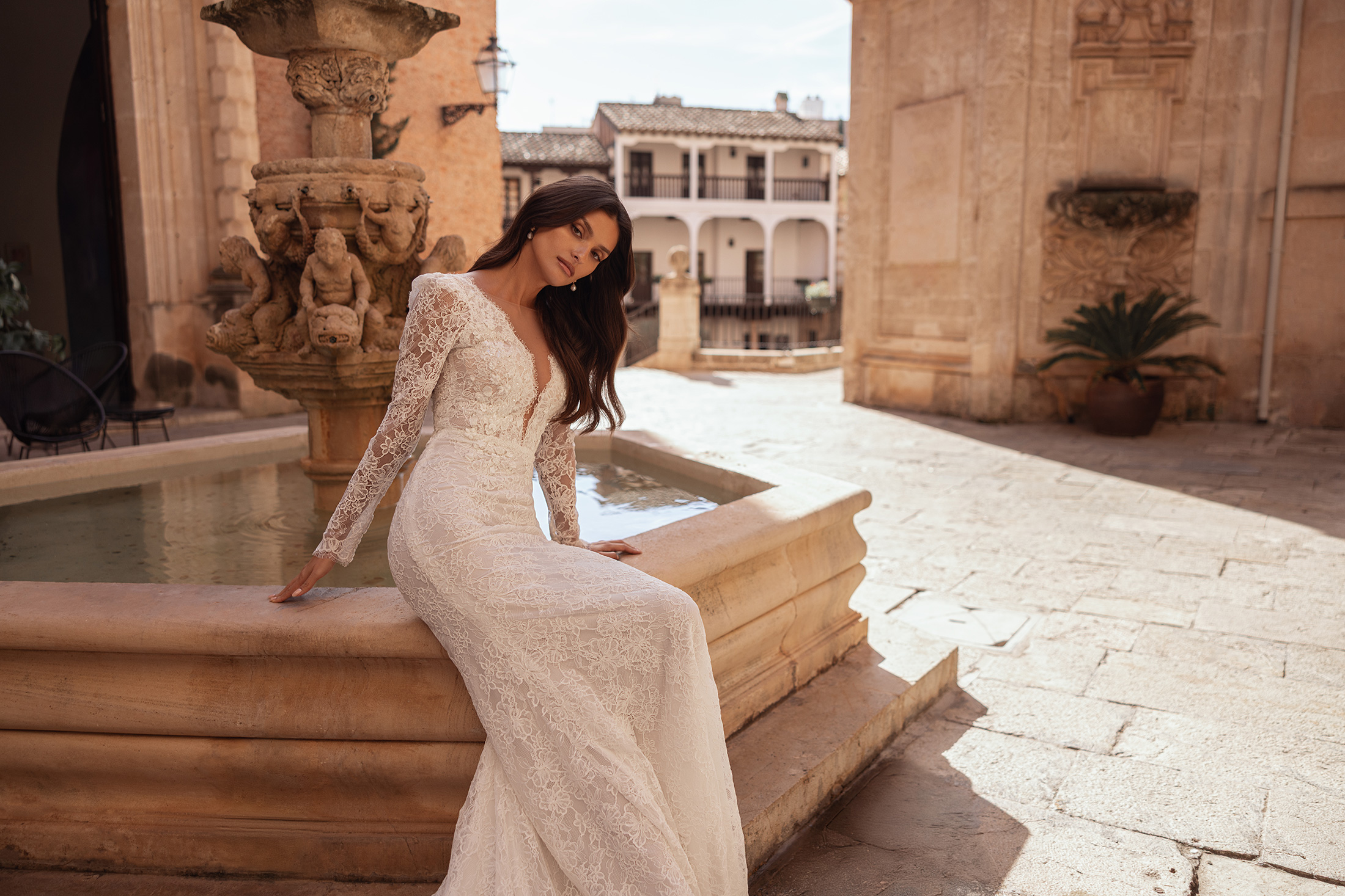 Gracefully sculpted with an air of classic sophistication, this gown embodies understated elegance through exquisite lace craftsmanship. The fitted silhouette is tailored in allover Alençon lace, softly contouring the figure before flowing into a refined, elongated skirt with a gentle train. A plunging V neckline is delicately framed by beaded floral lace, adding depth and couture detail without overwhelming the design. Long sheer lace sleeves lend timeless romance and perfectly balance the clean, feminine lines. Finished with an effortless, fluid drape, the gown offers a beautifully polished and enduring bridal statement.