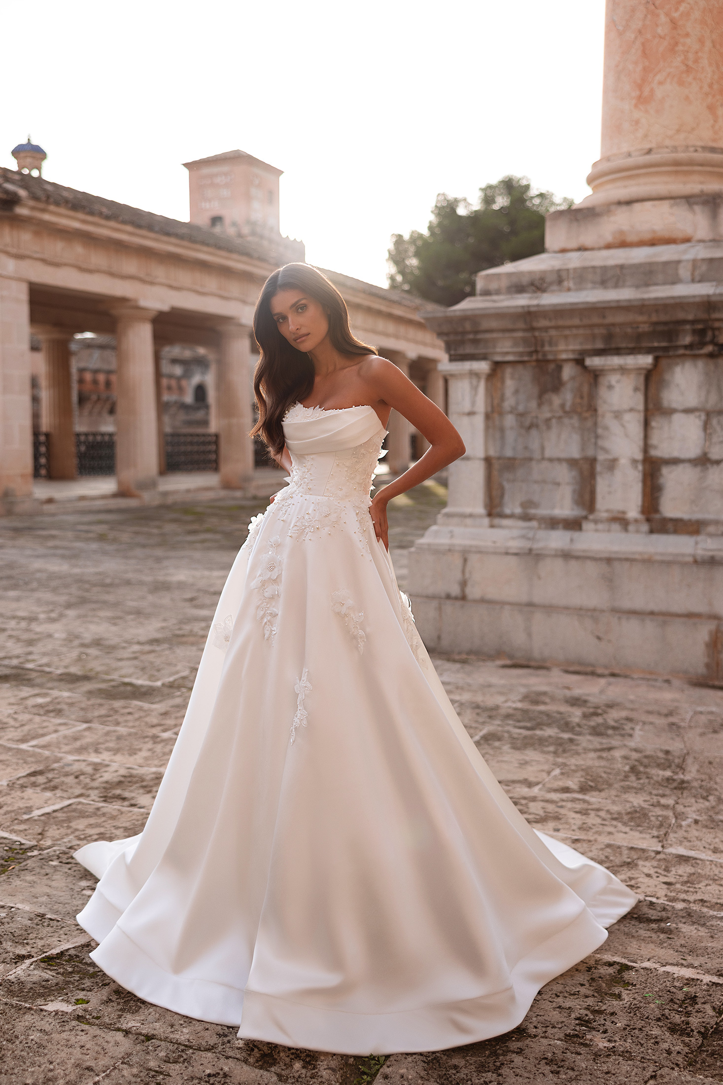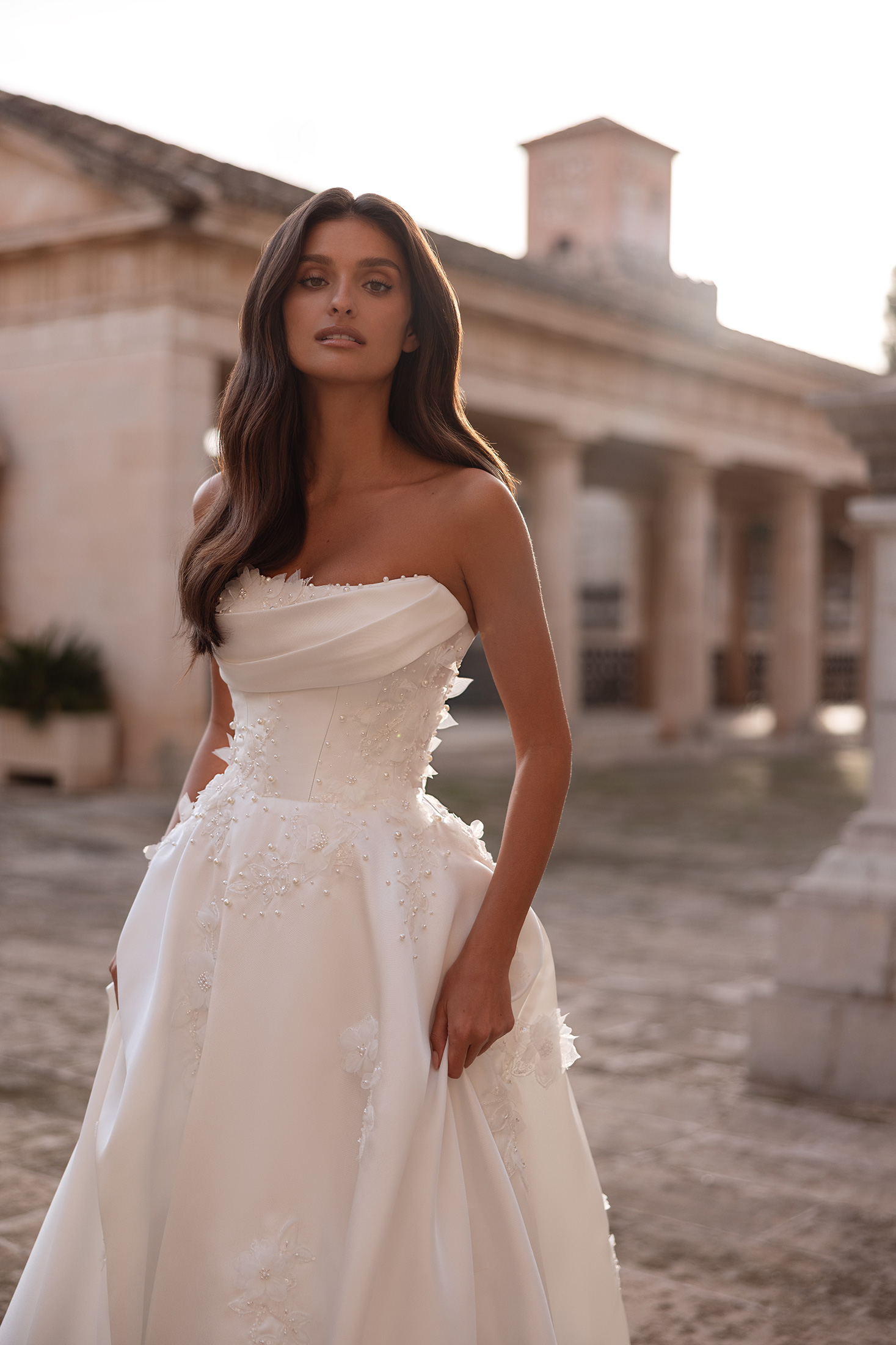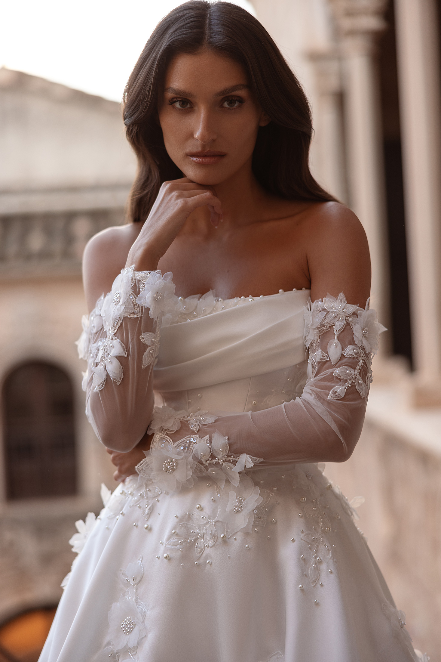Minimalist yet striking, the Petra gown reveals its beauty through refined textures and thoughtful craftsmanship. The strapless bodice features graceful draping along the neckline, creating a softly sculpted and elegant finish. Pearl beading and dimensional floral lace embellish the bodice and trail organically onto the skirt, adding depth and subtle luminosity. The full skirt flows effortlessly into a gentle train, maintaining a timeless and polished silhouette. Detachable sheer long sleeves offer a versatile styling option, introducing an ethereal, elevated touch, while the matching veil completes the look with delicate sparkle.