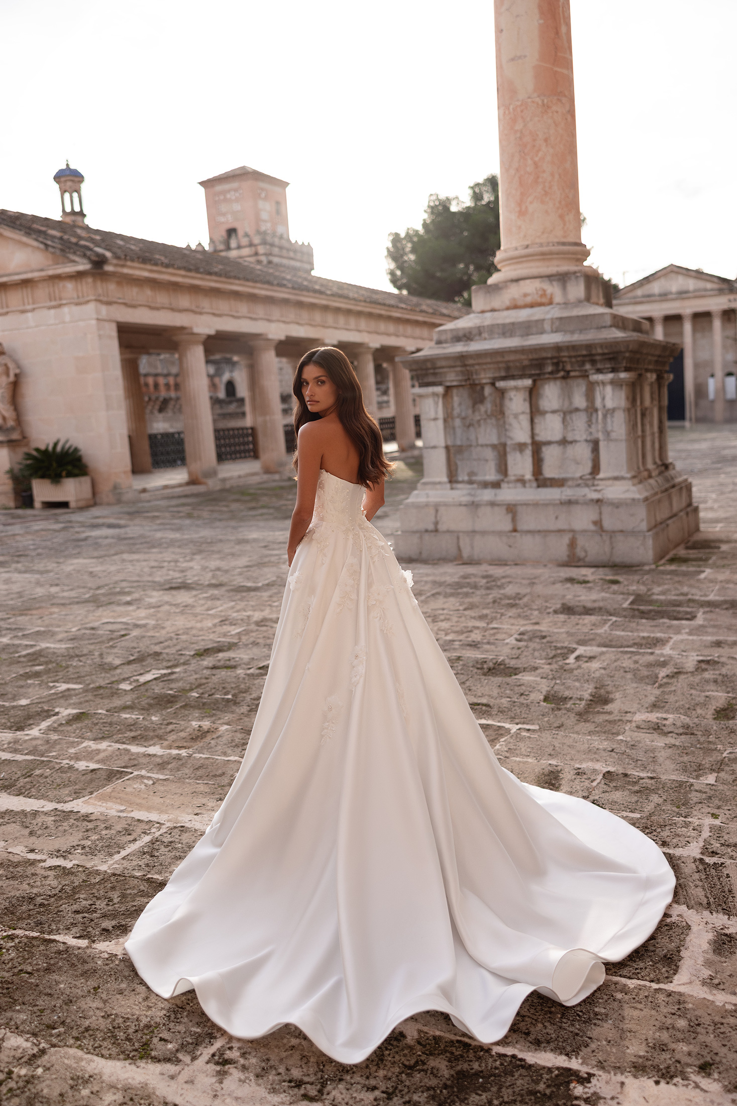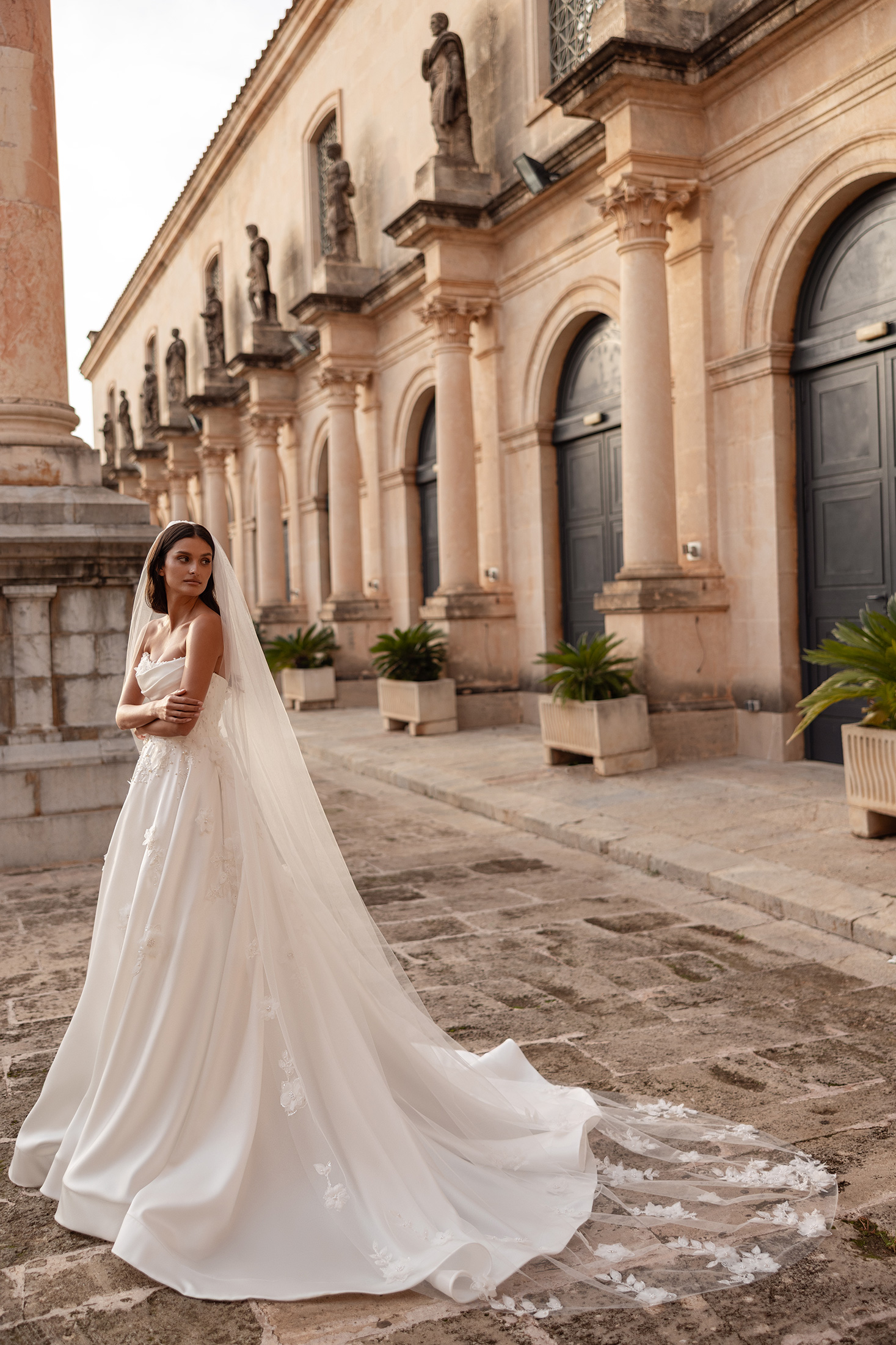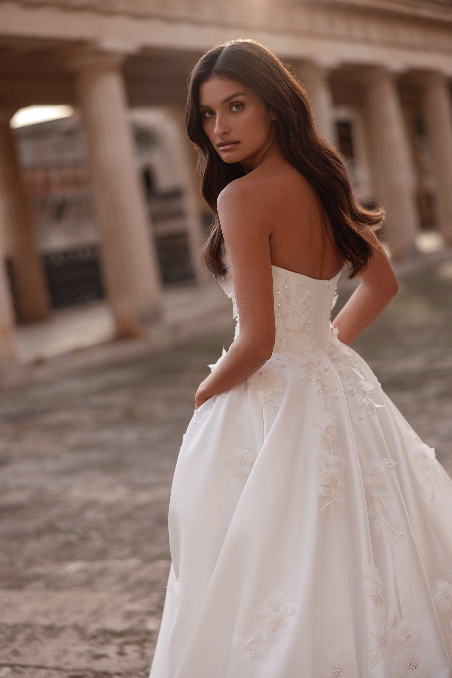 Minimalist yet striking, the Petra gown reveals its beauty through refined textures and thoughtful craftsmanship. The strapless bodice features graceful draping along the neckline, creating a softly sculpted and elegant finish. Pearl beading and dimensional floral lace embellish the bodice and trail organically onto the skirt, adding depth and subtle luminosity. The full skirt flows effortlessly into a gentle train, maintaining a timeless and polished silhouette. Detachable sheer long sleeves offer a versatile styling option, introducing an ethereal, elevated touch, while the matching veil completes the look with delicate sparkle.