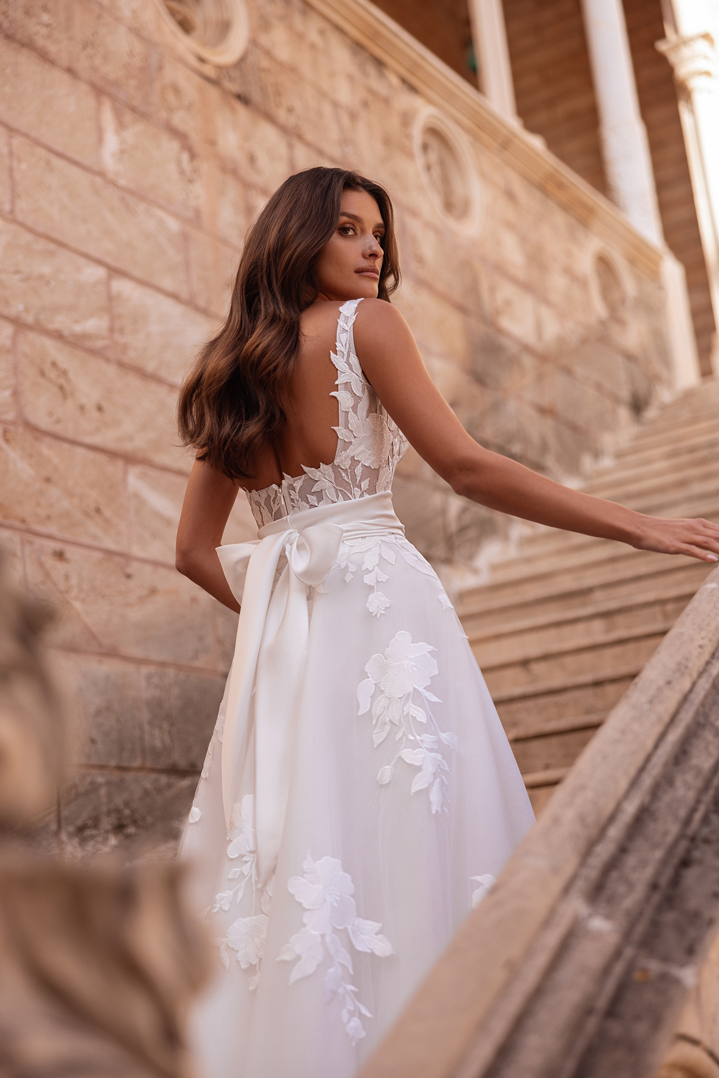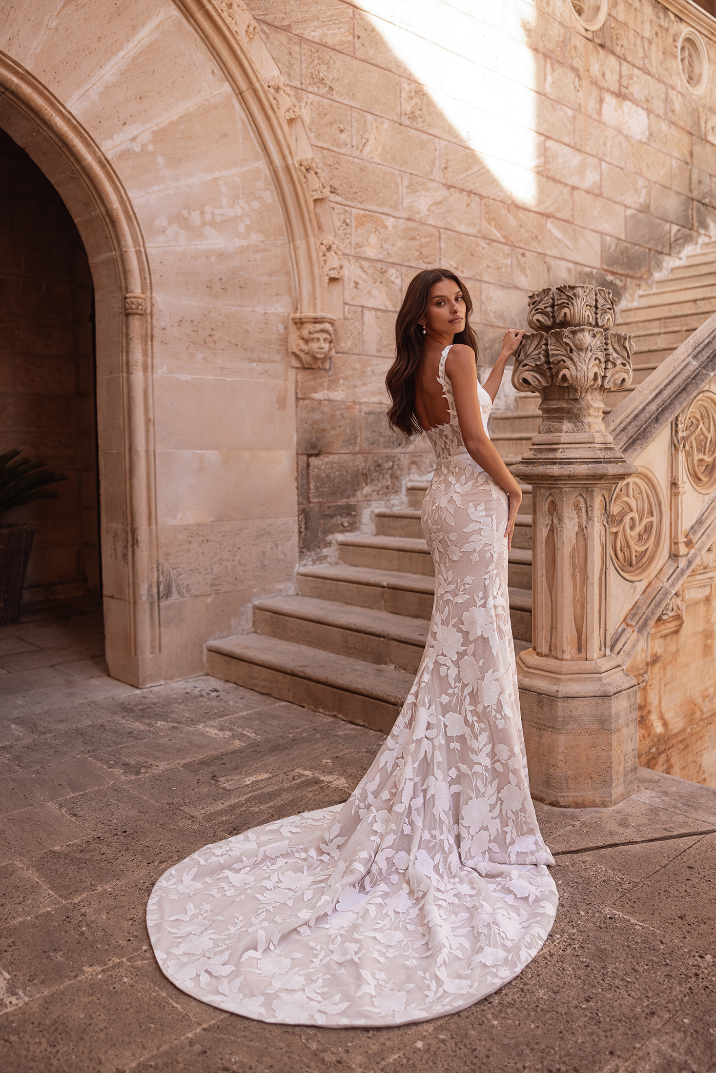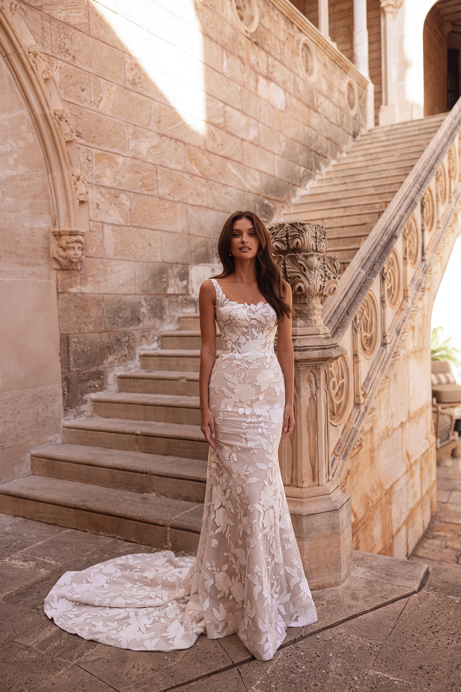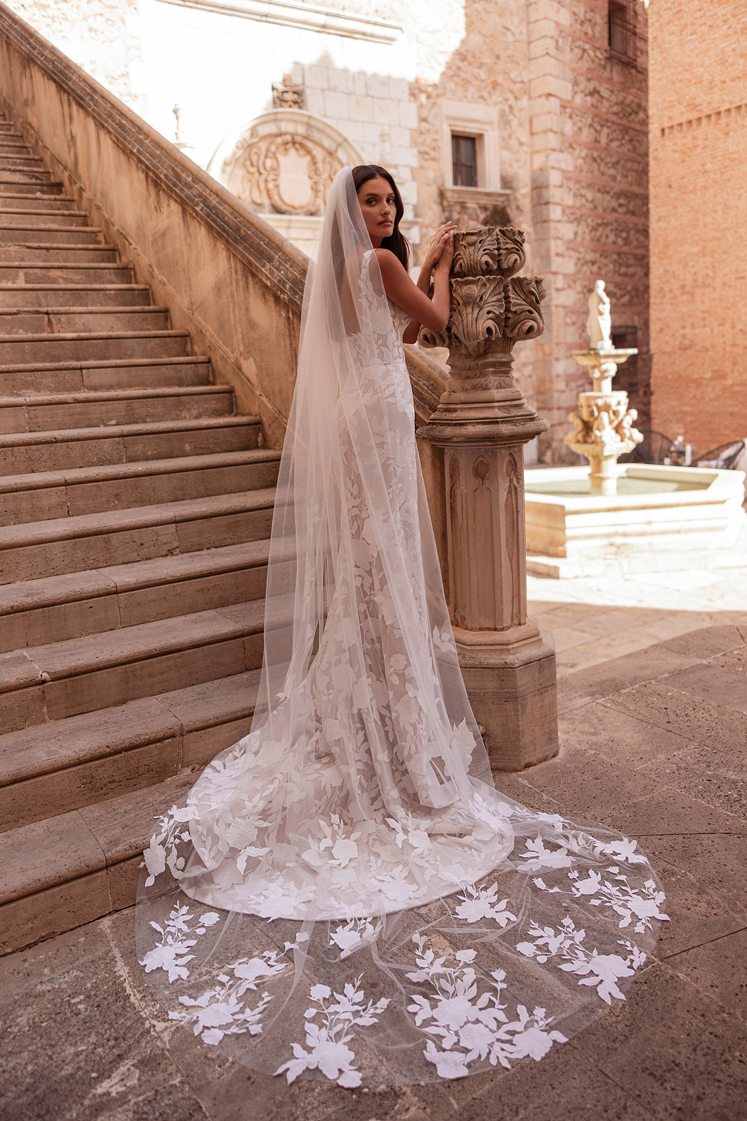 Bold yet undeniably bridal, Catrina balances striking design with timeless elegance. Crafted in allover matte macramé lace layered over a subtle glitter tulle base, the gown catches the light with refined restraint. The structured silhouette is defined by a modern square neckline and matching square backline, creating clean, architectural lines. Lace motifs flow seamlessly from bodice through the skirt for a cohesive finish. A detachable overskirt adds drama and versatility, while the matching veil completes the look with polished harmony.