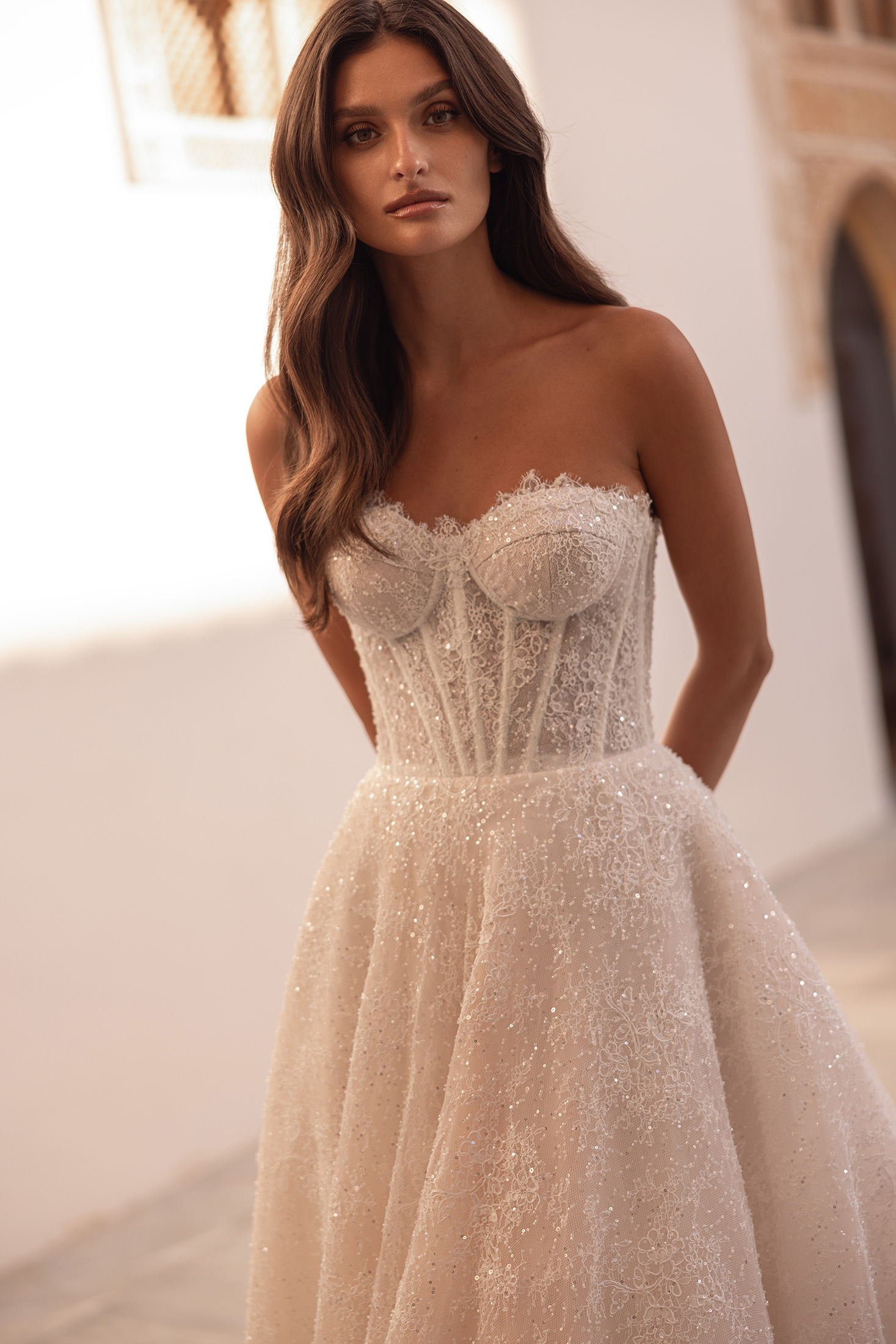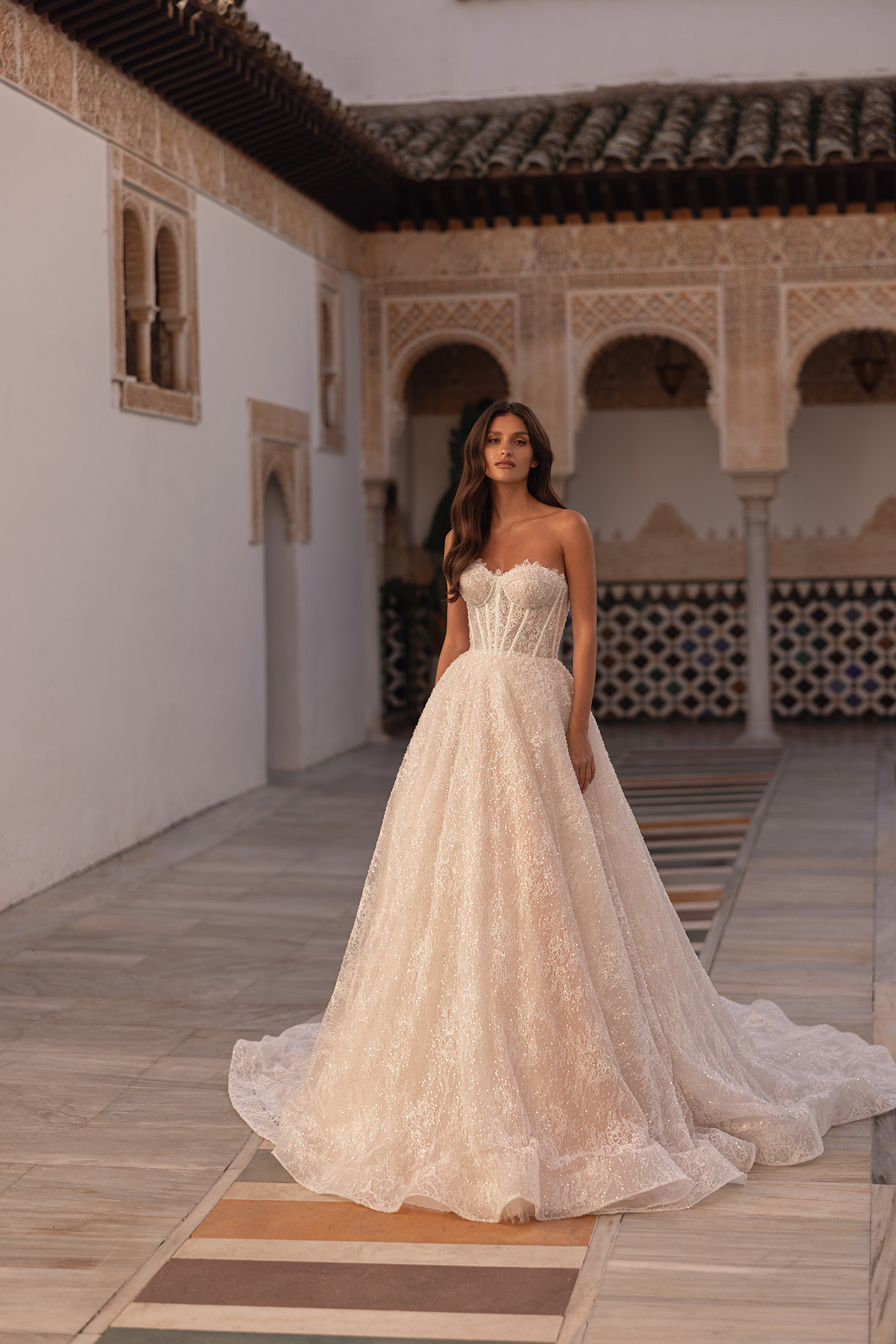Luxurious at first glance and captivating in every detail, this gown offers a modern interpretation of royal elegance. The boned strapless bodice features defined bust cups that sculpt the silhouette with precision and grace. Entirely crafted in exquisite Alençon lace, the gown is richly embellished with beads and sequins throughout, creating a luminous, highly detailed surface that is the true highlight of the design. A detachable long-sleeved, high-neck bolero adds a regal finish and styling versatility, elevating the look with timeless sophistication.