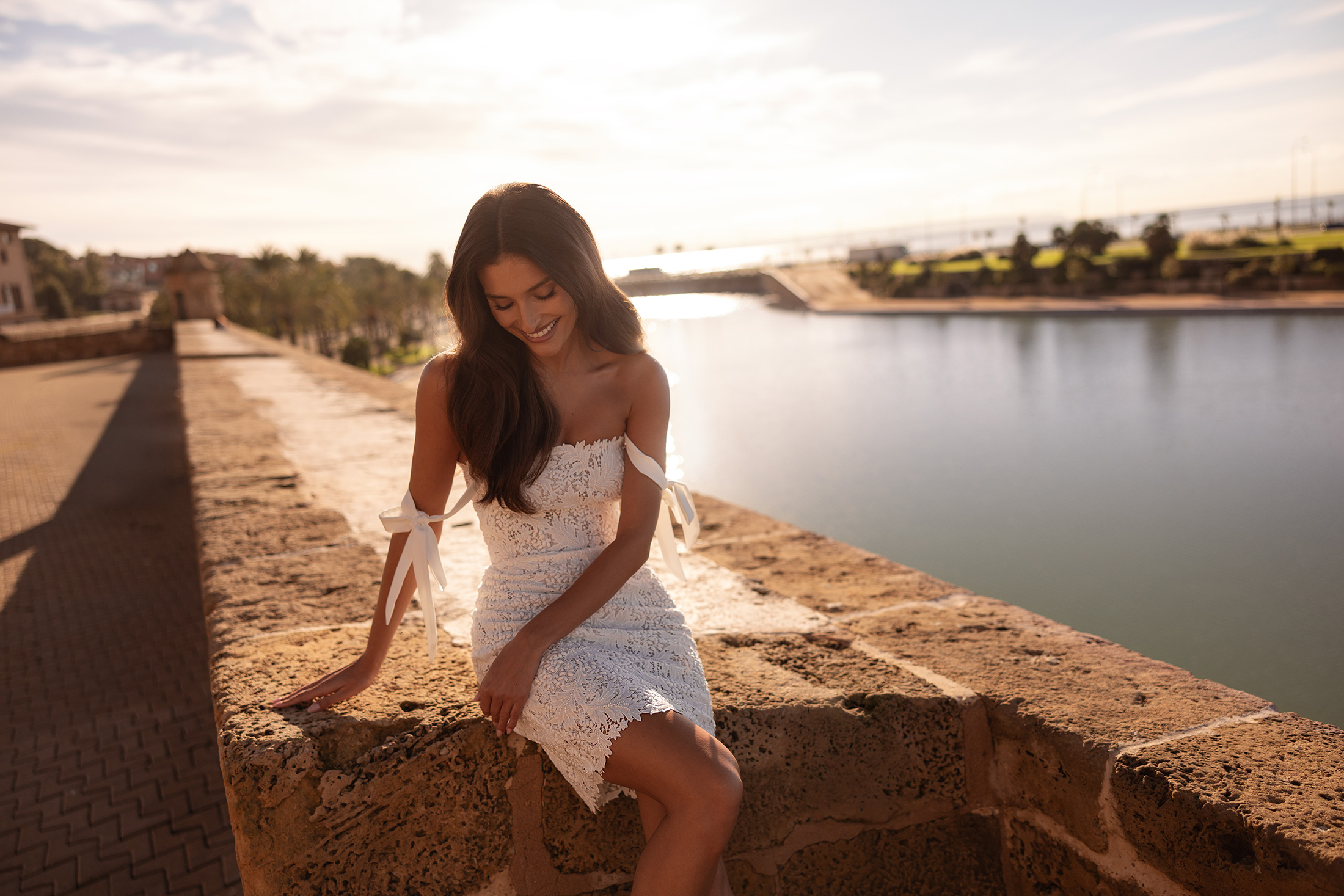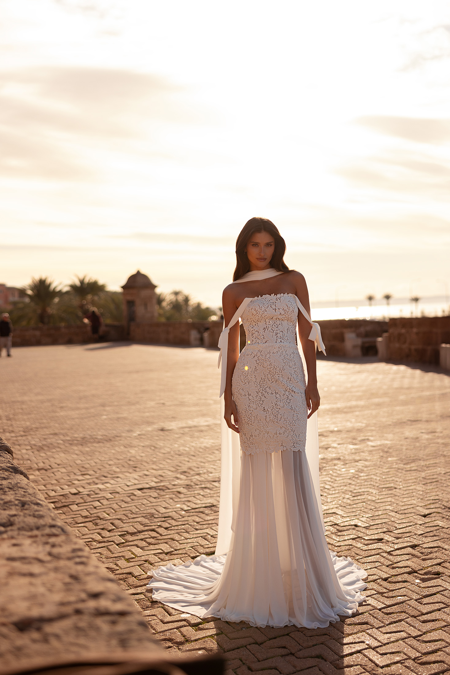 With a sense of relaxed sensuality and timeless charm, this design feels both dreamy and undeniably chic. The strapless silhouette is tailored in intricate floral lace, richly beaded throughout to create subtle texture and luminous depth. Chiffon ties drape softly off the shoulders, adding a romantic, couture-inspired accent. A detachable chiffon scarf brings fluid movement and effortless elegance, while the removable chiffon train allows the silhouette to transform from sleek and modern to softly dramatic. Designed to transition seamlessly from ceremony to celebration, the gown balances refined craftsmanship with contemporary versatility.