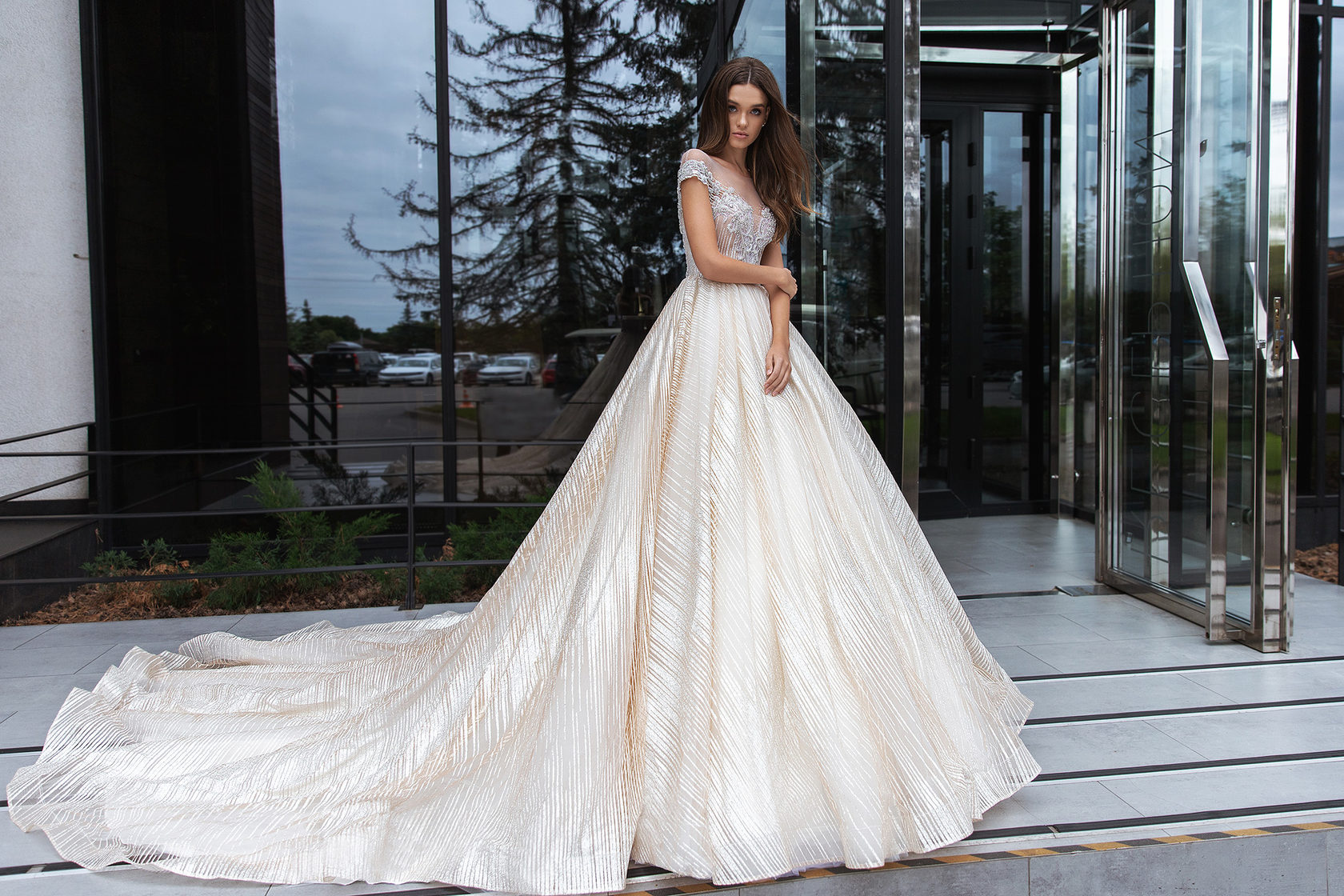 This wedding dresses of impeccable craftsmanship and beauty is inspired by a royal fantasy. Made of charming glittery tulle, it catches every glimpse of light. The monarch length train adds a wonderfully romantic edge. The corset and the illusion neckline are manually adorned with stones, beads and pearls. Seen in real life the gown leaves everyone stunned with awe.